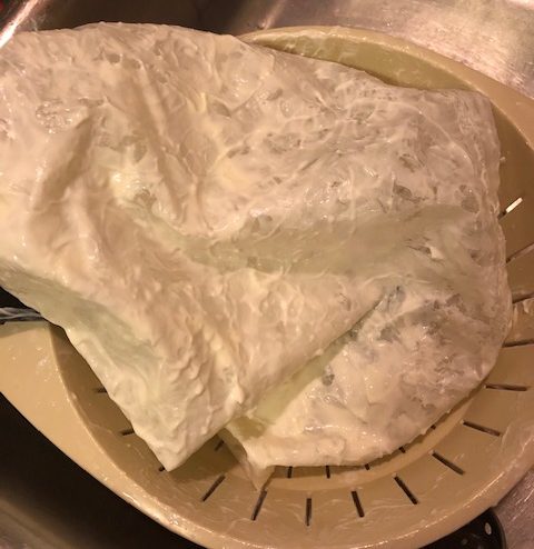 So I completely unfolded it, and then just folded it in half. You really want to have the cheesecloth doubled so that it is sturdy enough to handle and work with.