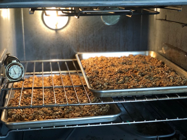 My cookie sheets are very large – 13″ x 18″ – so I cook the granola one tray at a time. I suggest you do the same. Once I tried putting a tray on each rack in the oven, to save time. The granola did not cook evenly, and it was way more of a hassle trying to switch the trays to different racks, etc., etc., to try to get it to cook evenly, so don’t do that. You can’t be in a hurry when you make this. Another thing I tried once was putting all of the granola on one tray, to save time. That was a very bad idea. Don’t do that either. Now, write down what time it is on a piece of paper or sticky note somewhere, then put the first tray on the center rack in your preheated, 300° oven, and set the timer for 10 minutes.
