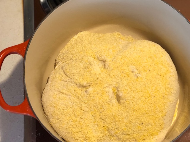 After 15 minutes, get a kitchen towel (NOT terry cloth) – I like the tea towels from Trader Joe’s or IKEA – and put a generous layer of course stone ground cornmeal or wheat bran on the towel. You can also do this with flour, but I am so traumatized after my dough sticking that one time that I use corn meal instead – it works for Brian every time. But really, that old dough stuck so badly because it had fermented too long, but let’s continue.