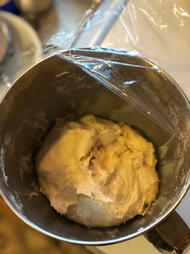 Now scrape down the sides and cover your bowl of dough with plastic wrap and put it in a warm place in your kitchen, or at least an undisturbed place.