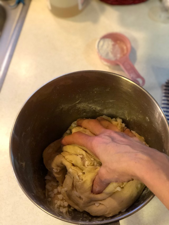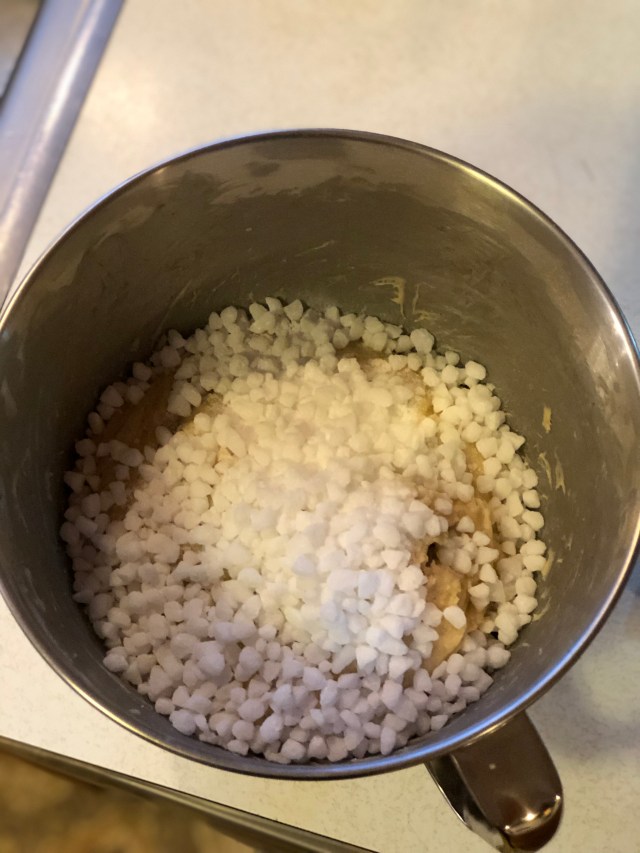 Ok, so the dough got smaller, but not as small as it was originally, and the texture should be soft and a little buttery (surprised?) and easy to handle. Now throw in about a cup and a half (or one entire package) of the pearl sugar. I know it looks like a lot. Don’t worry. It will be amazing!