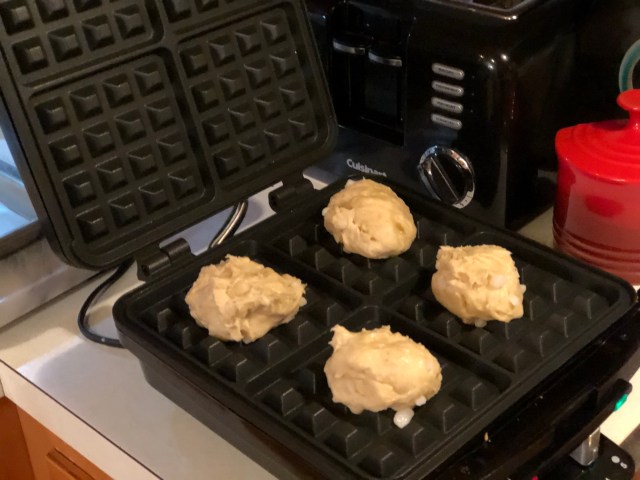 Once your waffle iron (Belgian waffle iron) is good and hot, place one ball of dough in each waffle square. No need to oil your waffle iron – these have lots of butter in them and they shouldn’t stick!