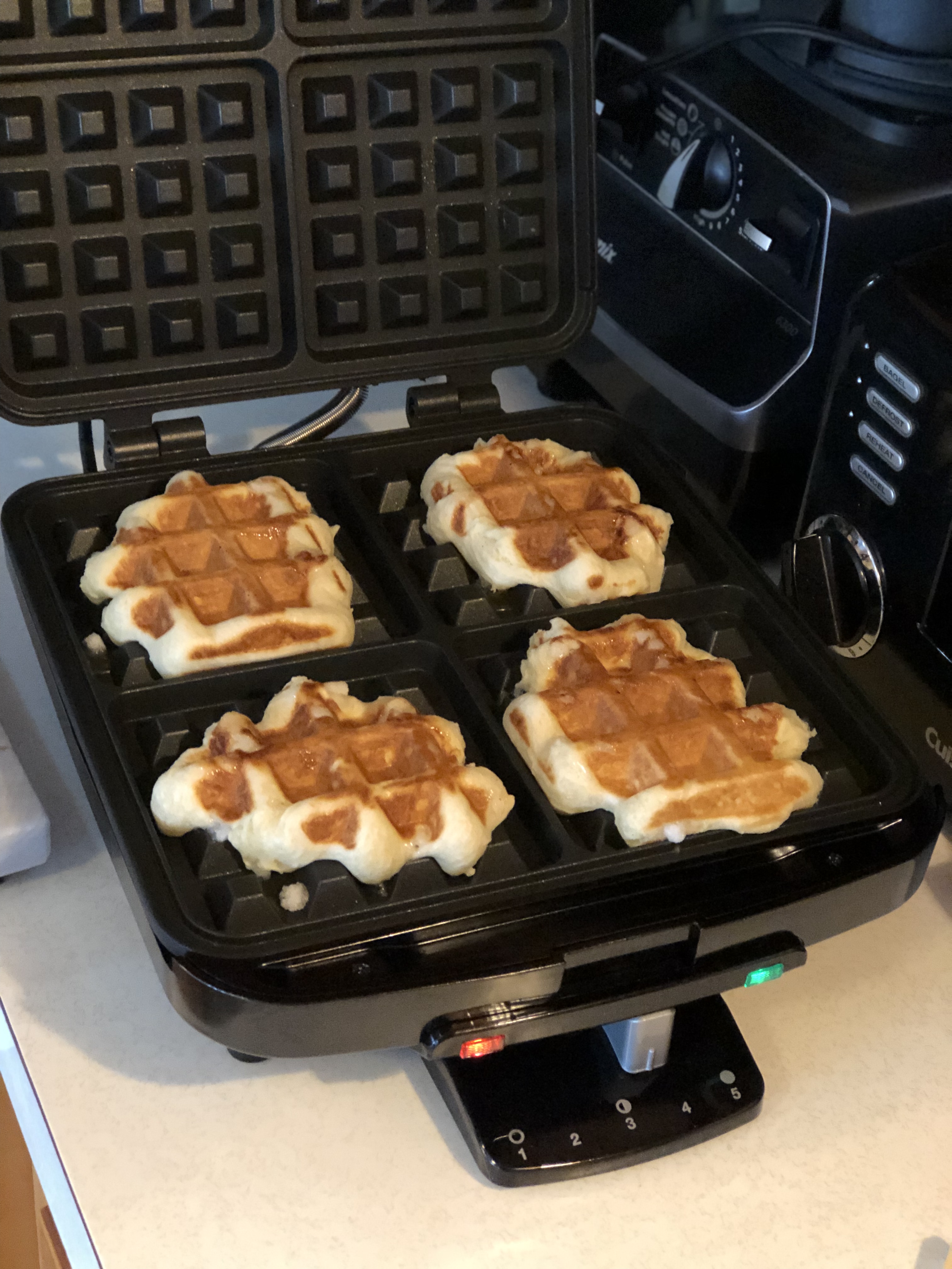 Don’t worry if some of the sugar pearls are coming out. They will melt into caramelized sugar – delicious. It might take around 3 minutes or so to cook, but that was just for my waffle iron. They should be golden brown.