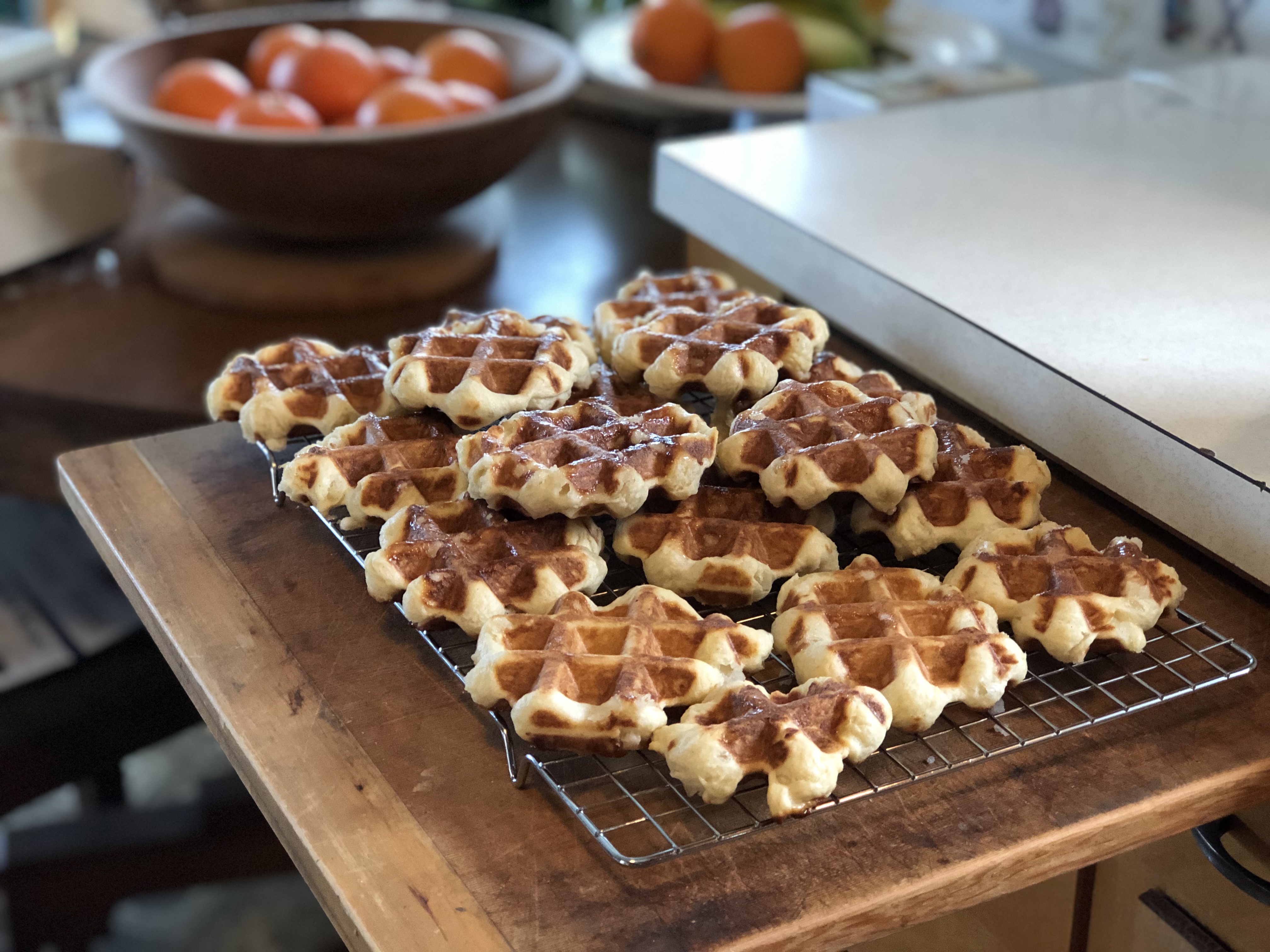 Carefully remove from the waffle iron with wooden tongs or something else that won’t scratch your waffle iron – these waffles will be HOT, due to the melted sugar, so don’t touch them with your fingers. I learned that lesson the hard way. Dear husband says I have “restaurant hands” and can touch very hot things, but not melted sugar. That’s where I draw the line. Transfer them to a cooling rack. And don’t worry about any sugar pearls that are remaining on the waffle iron. Just put your next batch on there to cook. The more sugar residue there is, the more caramelized each batch will be.
