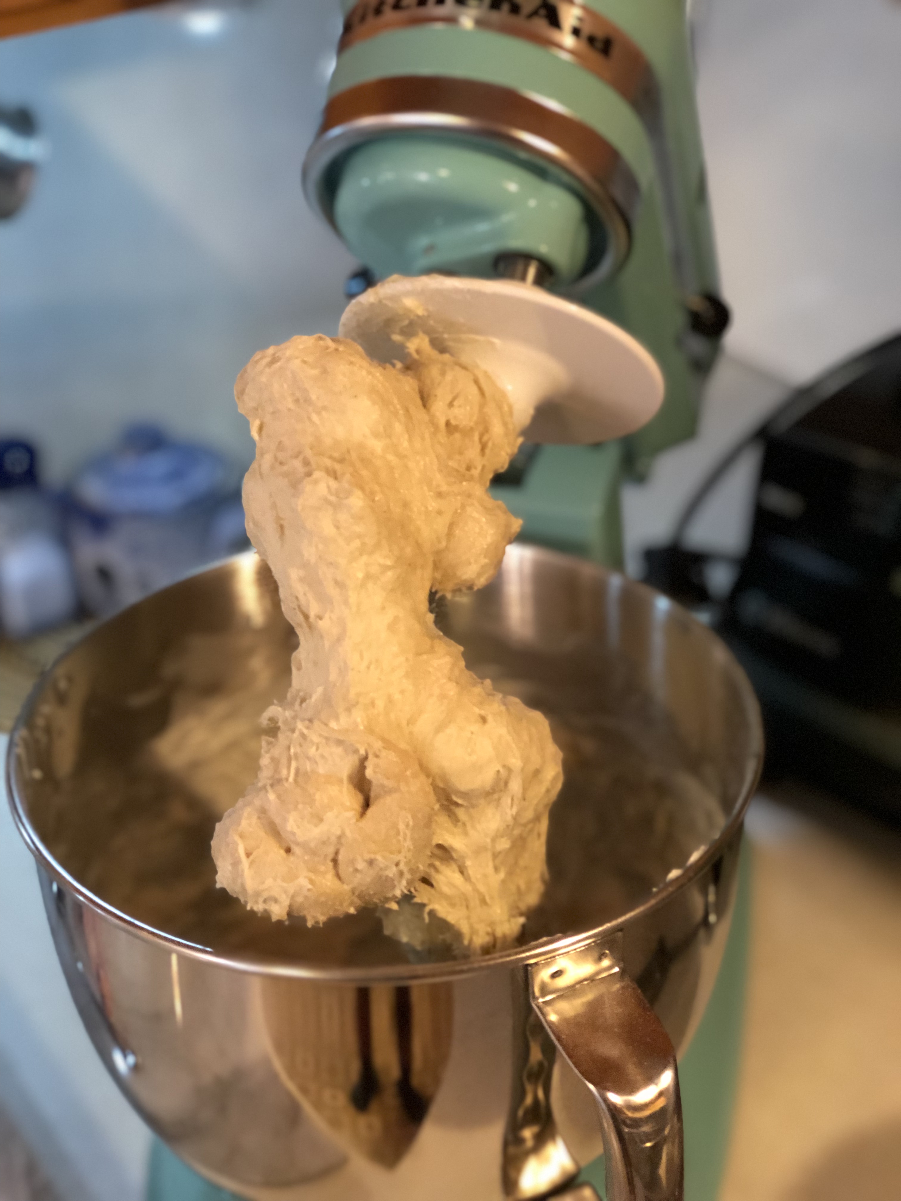 This may take a while. Scrape down the sides of the bowl as necessary. When it’s properly mixed, the dough will be softer, and still a bit elastic.