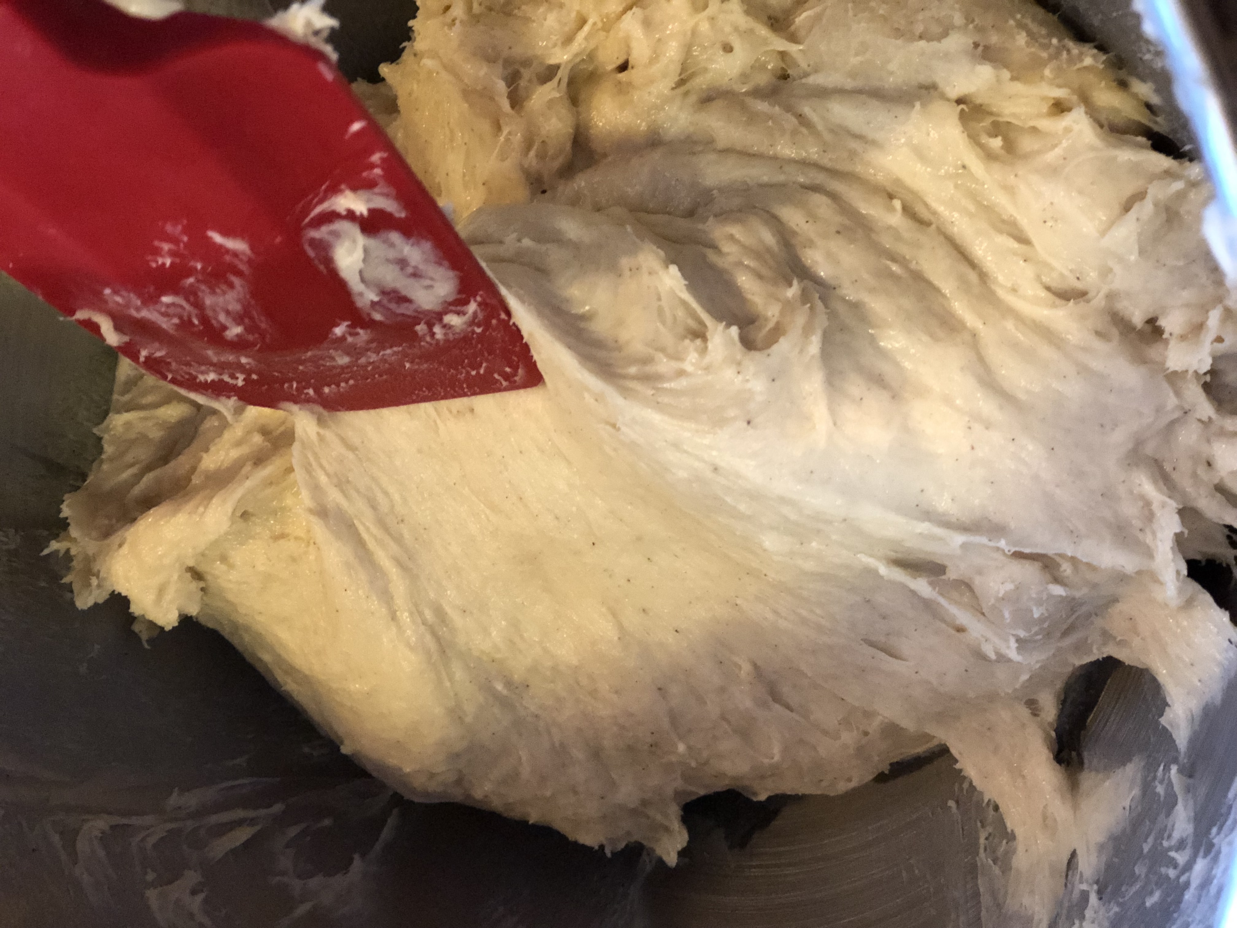 You can mix this by hand with a nice solid wooden spoon, or use the paddle attachment and mix it in your stand mixer. I’ve done it both ways, and I think it is a bit easier using the stand mixer. Either way, mix it well, until the dough becomes a bit elastic or stretchy. At this point you will want to add in the softened butter (1 cup, or 2 sticks, cut into pieces) little by little – switch to a dough hook! (By the way, if you are doing this by hand, mix everything at once, butter and all.) But back to the stand mixer. Add in the butter, using the dough hook, and mixing on a low speed, until all the butter is incorporated.