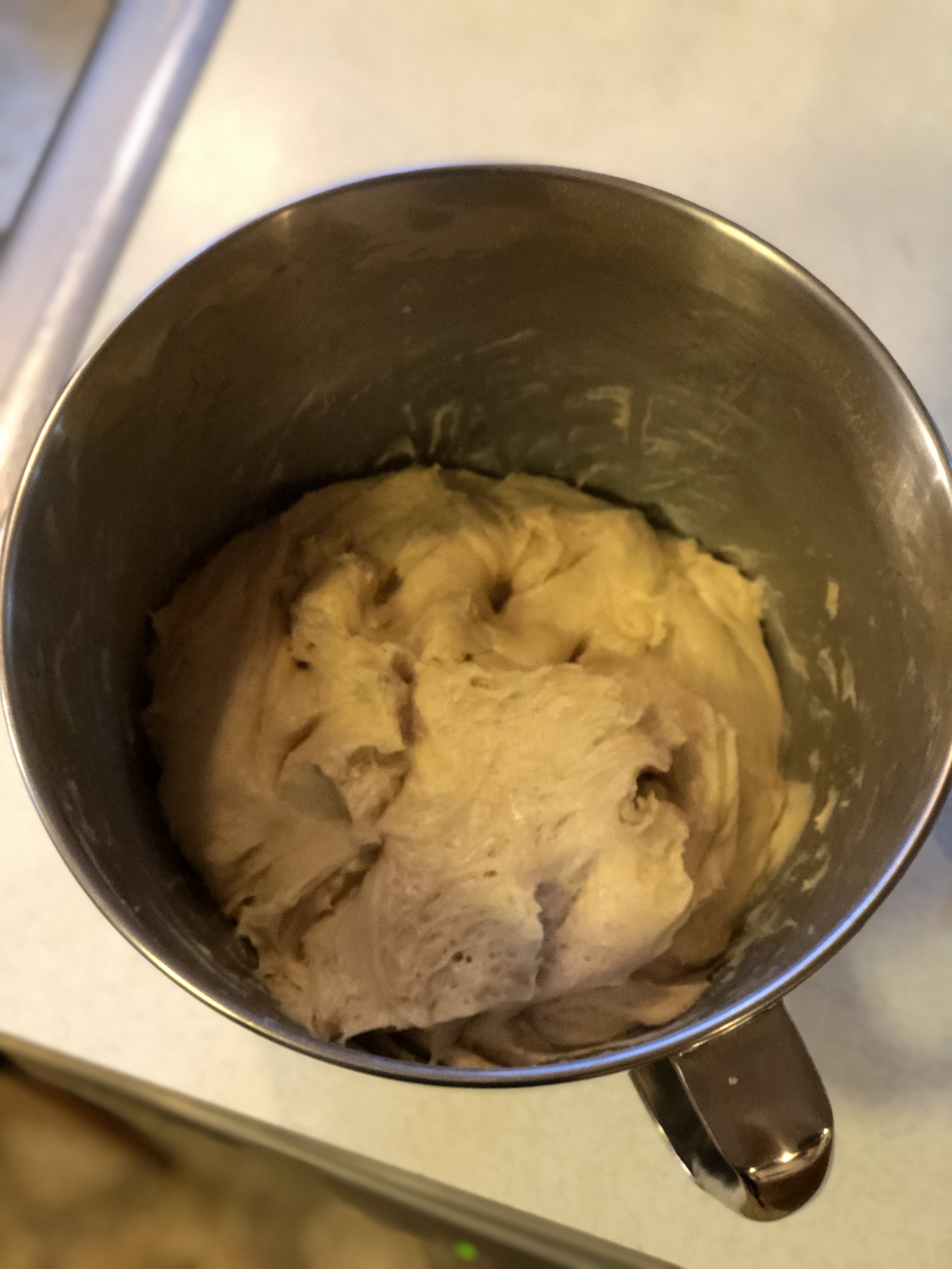 Now that’s what it’s supposed to look like. Kind of like a latté. I am only just getting to know yeast. As my friend Carol says, yeast is weird and unpredictable. But I know this, I wasn’t going to make an entire recipe and not know if the yeast was bad or good. I’ve done that before and regretted it. Make sure the yeast foams up a bit! Once you’ve gotten this far, put the milk/yeast/sugar/flour mixture into a large mixing bowl or bowl of your stand mixer (or to save time, do the whole thing in the mixing bowl to begin with. Then add 3 and 3/4 cups (17 ounces) of all purpose flour, 2 eggs at room temperature, 1 teaspoon salt, 1 teaspoon vanilla, and 1 teaspoon cinnamon. Just plop it all in there all at once.