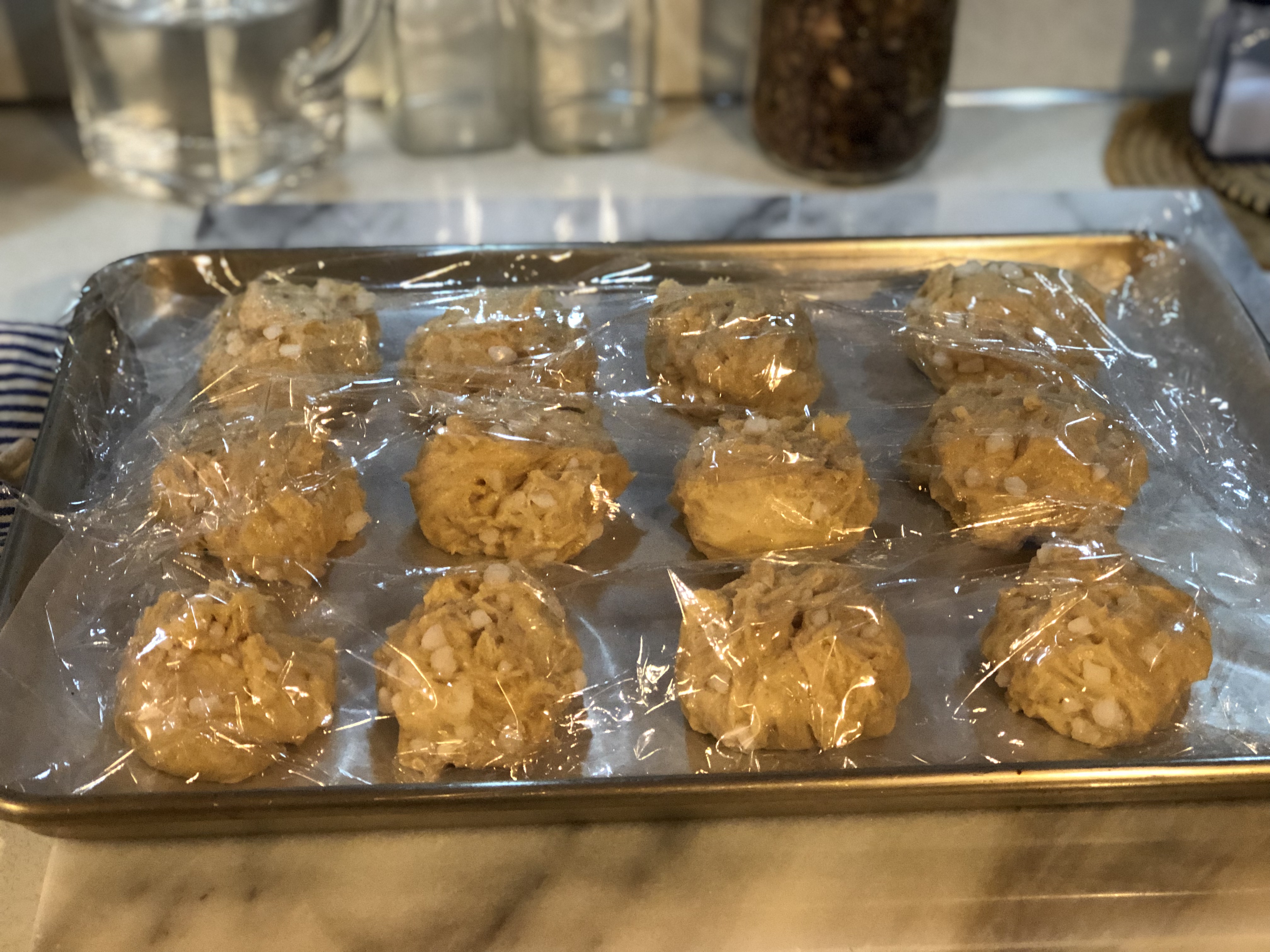 - Divide dough into twenty-four balls of dough, put them on a cookie sheet, cover them with plastic wrap and let rest (and rise a bit more) for 15 minutes.