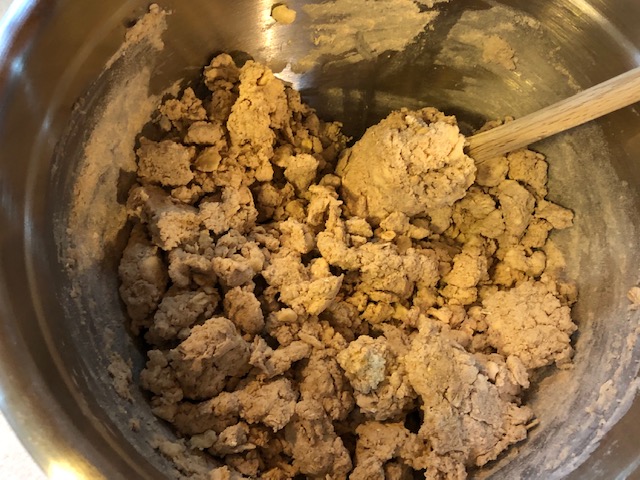 - Knead the dough in the bowl just a bit, until it holds together, and turn it out onto a floured board or countertop – it will be crumbly.
