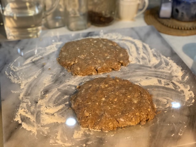 - Shape each half into a round that is about 3/4″ thick.