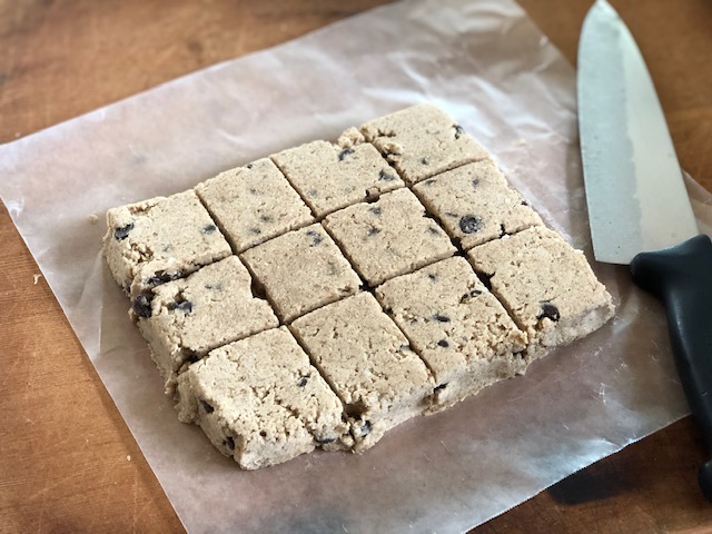 After an hour or two, cut into squares. This is a half batch, and it makes twelve square cookies…