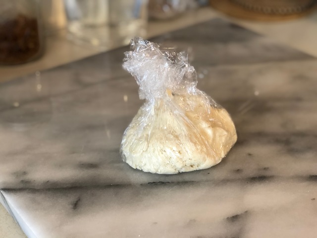 Now, with cupped hands, squeeze the dough in its plastic wrap firmly into a mound. Squeeze several times quickly and firmly to make sure the dough is cohesive. The dough should come together nicely.