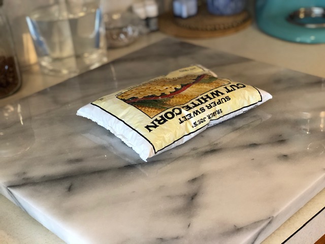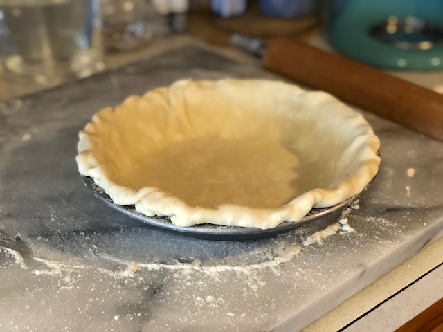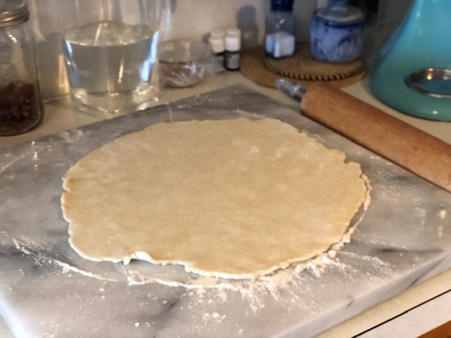 About rolling out the dough – your rolling pin should be heavy! The light weight ones just won’t do the trick. Take your disc of dough out of the fridge about 15 minutes before you want to roll it out. You want it to be pliable. If your kitchen is very warm, maybe 5 or 10 minutes will do. But don’t make the mistake that I often make, which is trying to roll out dough that is too cold. It will crack! Throw your pie pan into the freezer. And get a bag of frozen vegetables (I have one that is reserved specifically for this use) and place it on your work surface. This will chill the work surface while your dough is becoming pliable.