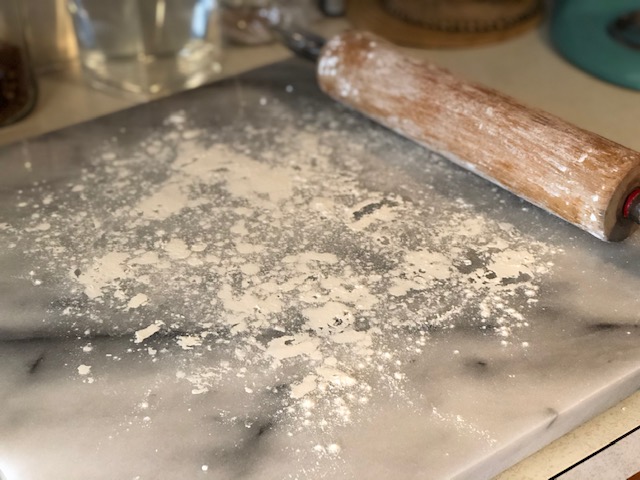 When dough is pliable, after about 10 to 15 minutes, put the frozen veggies back in the freezer and make sure your work surface is dry. It should be nice and cold! Use enough flour on your rolling out surface so that your dough doesn’t stick. Flour your rolling pin.