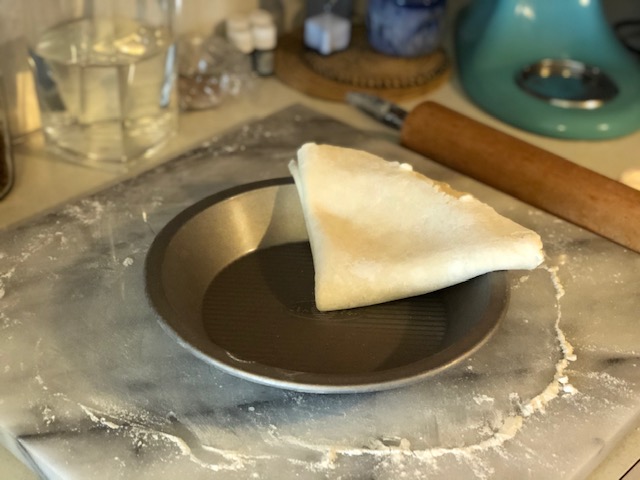 Once the dough is about 1/8″ in thickness, take a pizza cutter or knife and trim off the edges to make a nice round circle (this is optional). The circle should measure whatever your pie pan is from edge to edge, plus 3″. I always measure to make sure I’ve got the dough rolled out wide enough to do the job. 13″ is usually a good size, but measure please. Pull the cold pie pan out of the freezer. Fold your dough in half, then in half again, and place the dough in the pie pan with the middle fold-y corner thingy in the middle of the pie plate.