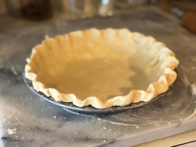 Chill the crust in the fridge for at least a half hour before using. Or, if you are planning ahead, wrap the whole thing, pie plate and all, in plastic wrap (sorry about all the wrap), then aluminum foil, and put it in your freezer. You can use it whenever your are ready. This makes your pie making a breeze. This is, of course, for pies such as pumpkin or pecan. If you are making pie crust for a double crust pie, like apple pie, you can freeze the discs of dough, to be rolled out at a later date, if you like the idea of making ahead. I surely do. Just pull out the discs of dough the night before and let defrost in the refrigerator overnight.