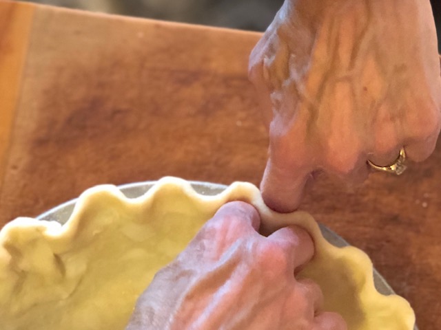Now crimp the edges with a fork or make a cute little design with your knuckles (if this is for a one-crust pie, such as pumpkin or pecan pie). Don’t use your finger tips, because you might tear the dough. Use your knuckles.