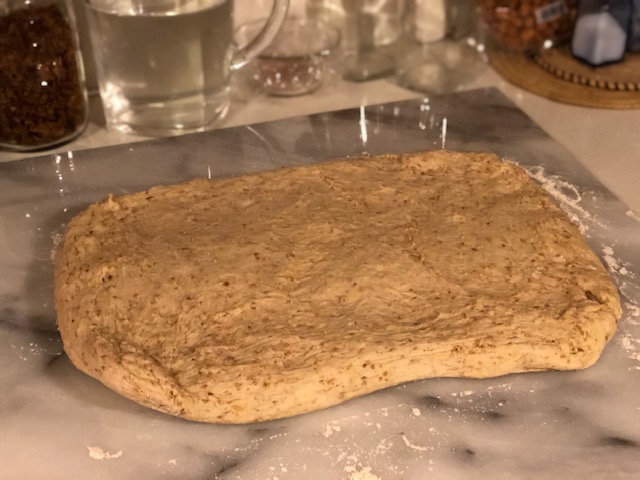 4. Adjust oven rack to the middle position and heat oven to 375°. Grease 2  8 1/2″ x 4 1/2″ loaf pans with vegetable oil or unsalted butter. Transfer dough to a lightly floured work surface and pat into a 12″ x 9″ rectangle (I mark it out in the flour with my finger beforehand). Cut the dough in half cross-wise. With a short side facing you, starting at the farthest end, roll one dough piece into a log, keeping the roll taut by tucking it under itself as you go. Seal the loaf by pinching the seam together. Repeat with the remaining dough.