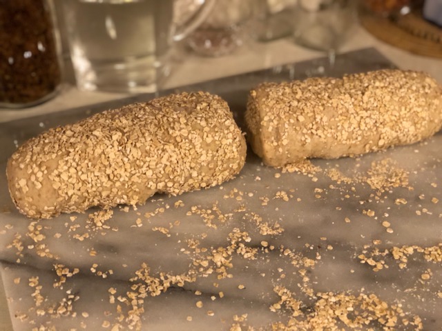 5. Spread the oats on work surface in front of the loaves. Wet your hands with water, and lightly wet each loaf, then roll them in the oats to coat evenly. Place loaves seam side down in greased loaf pans, pressing gently into the corners. Cover lightly with plastic wrap or tea towel and let rise until almost doubled in size, 30 to 40 minutes. The dough should barely spring back when poked with a knuckle.