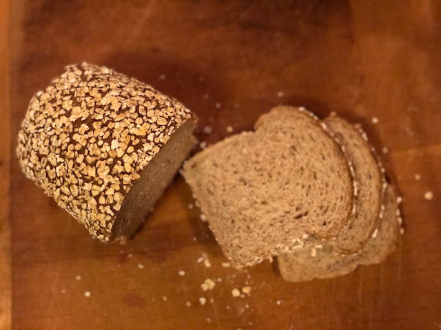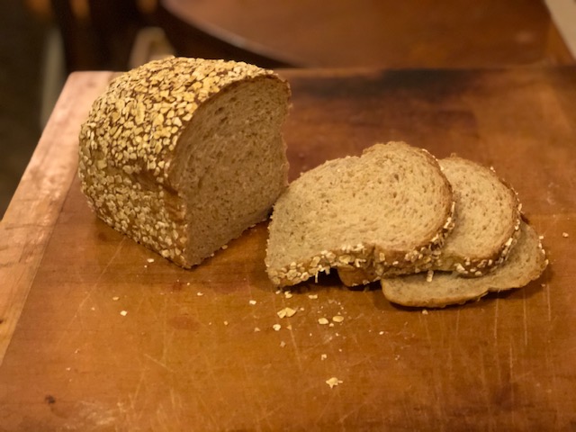 This is awesome sandwich bread, especially when we’re trying to reduce plastic consumption. The storebought sandwich breads come wrapped in two countem two layers of plastic. But the thing about getting a fresh loaf at a bakery is that most of the stuff I think tastes best has a crust like an armadillo. This bread tastes great, it’s fresh, its crust is easy to slice and won’t wreck your teeth. And it’s two fewer plastic bags into the environment every time, or four if you load both barrels as above.