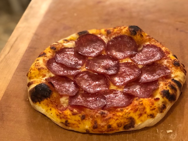 8. After oven has been preheated for about an hour, shape and stretch the pizza dough by hand, placing it on parchment paper for easy transferring to the oven. Top with favorite sauce, cheese, and toppings. Don’t overdo it with the toppings, or it will weigh down your crust.
