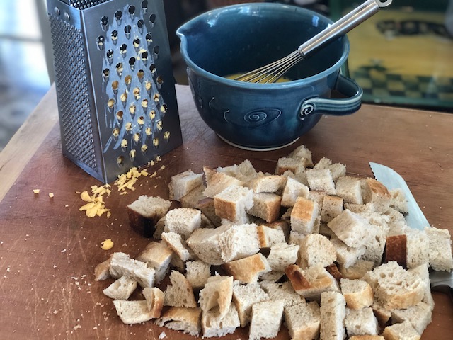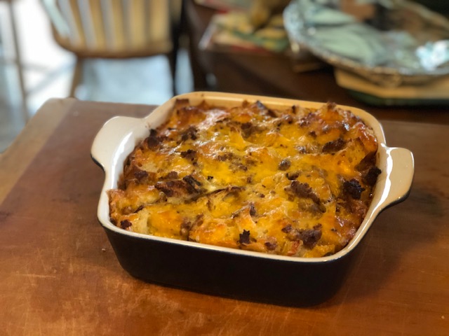 One year Carol made something delicious in a large casserole dish. Kind of like a cheesy savory bread pudding with a crispy exterior. I asked if I could get the recipe. She called it an “Easter Quiche”. It’s also called a strata – layered bread, cheese, sausage, veggies… whatever ingredients you want, in an egg custard. You assemble it, and then it rests in the fridge overnight*, and then you can bake it in the morning with no fuss. It’s great for holidays, or if you have overnight guests, and you don’t want to get up and have to cook right away. Just grab a cup of coffee and preheat your oven. We have it every year on Christmas morning, which is perfect. And sometimes, because we have leftover bread (surprised?), or because I get a special request, we have strata on an ordinary day. And we might just have it for dinner. It’s delicious no matter what the occasion.