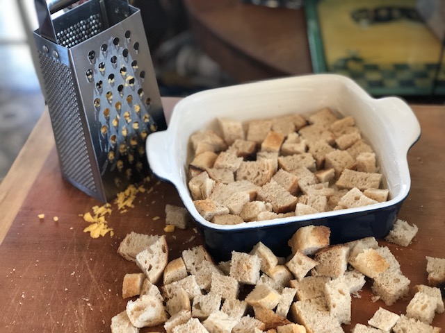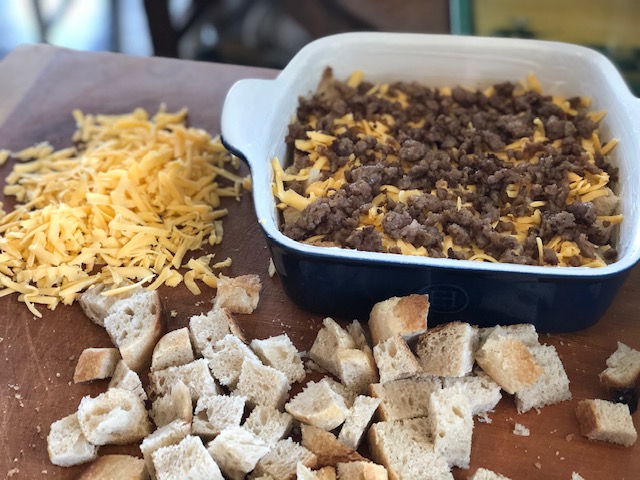 - Butter an 8″ x 8″ casserole dish or brownie pan. Layer the bottom with bread cubes, then half the sausage, then half the cheese. Repeat with another layer of bread cubes, sausage and cheese.