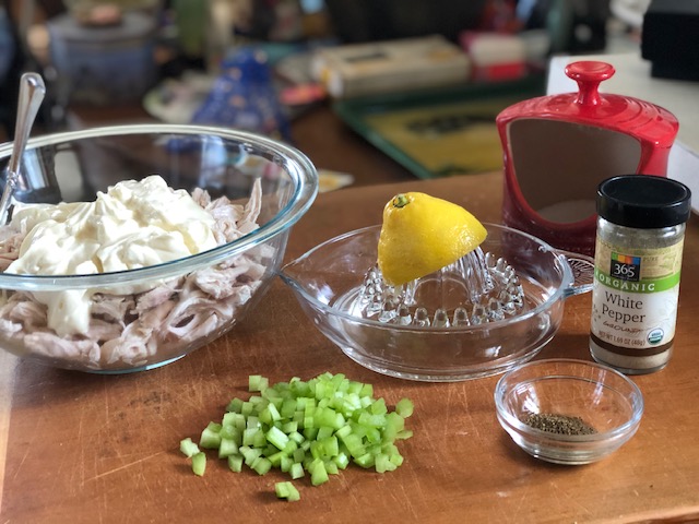 - When cool, shred the chicken into 1 inch pieces (you should have about 4 cups worth, more or less) and mix with the mayonnaise, heavy cream (if using), lemon juice, celery seed, salt, diced celery, and white pepper.