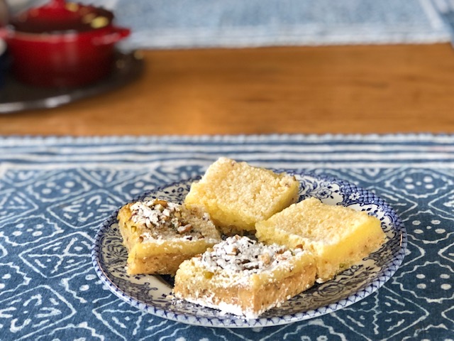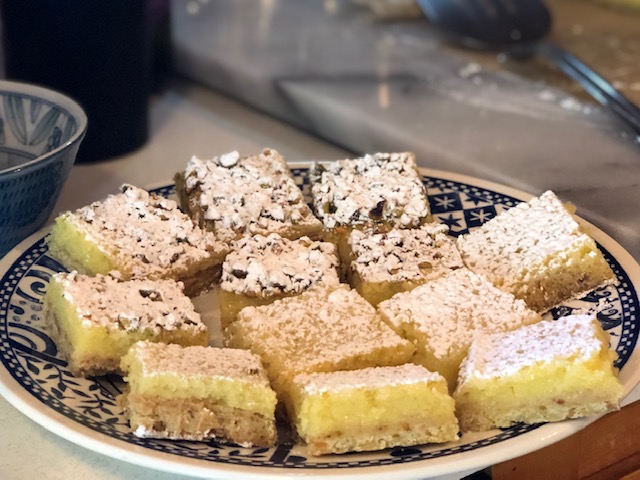 So as we tested out the lemon-pistachio bars, we all gave our opinions about them. I of course had tweaked the recipe to suit my tastes – I increased the filling by half, because who doesn’t want more lemon filling? I added more lemon and more zest for a bit more zing. And I sprinkled the pistachios on top of the filling instead of mixing them in. I also processed the pistachios with the crust so they would be finer and not in larger chunks.