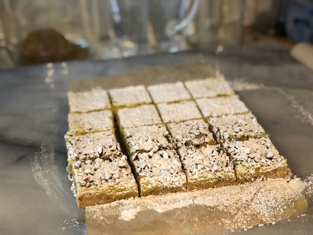 - When crust is lightly browned, remove from oven. Pour filling ingredients on the crust and bake for about 20 minutes, until set. About 10 minutes into the bake time, pull the pan out of the oven and sprinkle the finely chopped pistachios on top of the filling. Put back in the oven and finish baking.