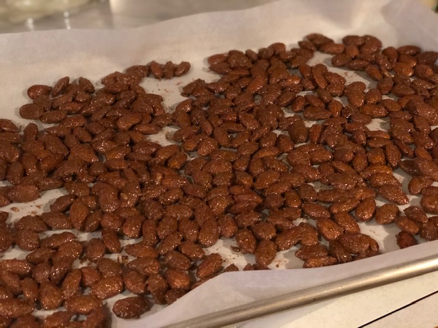 Turns out these almonds are really easy to make – yay! I found this recipe, from allrecipes.com, and it is a great springboard for making these almonds to exactly suit your taste. Basically, you beat an egg white and some vanilla (or water) until frothy, stir in raw almonds, add sugar, salt and spices, and then bake with an occasional stir… BAM! You’ve got your almonds!