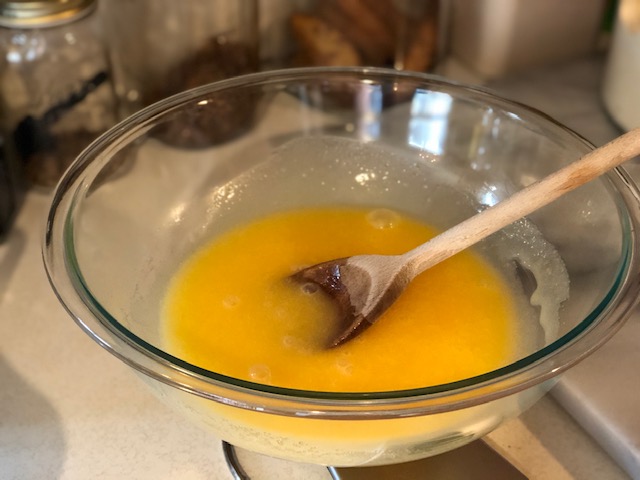 - Add in the eggs, mixing well after each addition. By the time you have mixed in the third egg, the oil should be well incorporated with no separating.