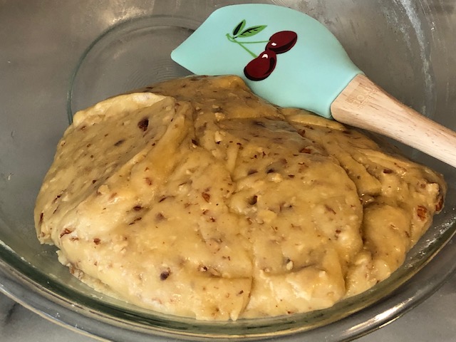 - Add the cooled almonds and mix well. Dough will be stiff and glossy.