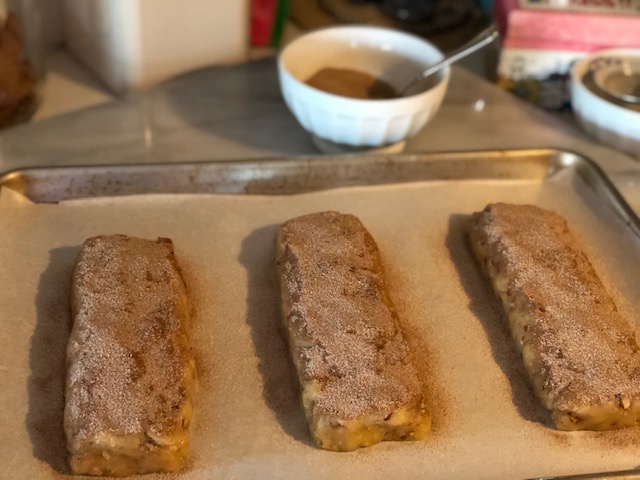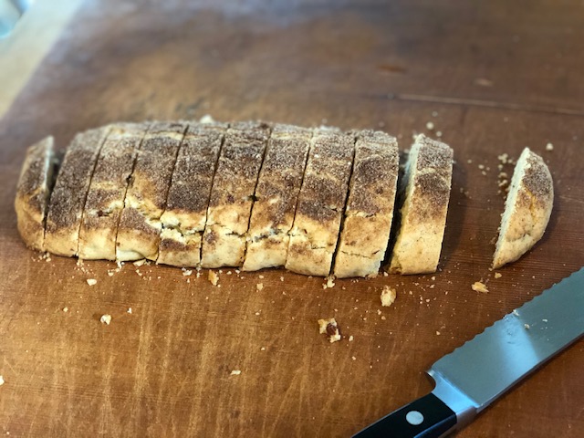 I had to text Lisa to ask her about details, because my memory is a bit fuzzy. Do you sprinkle the cinnamon sugar on the loaves before they are sliced, or on the cut side of the cookies after the loaves have been sliced? Lisa and her mom waited until the cookies were sliced to sprinkle with cinnamon sugar. Lisa asked me if I have a preference… I have tried both ways to see what I like best, and am still trying to decide.