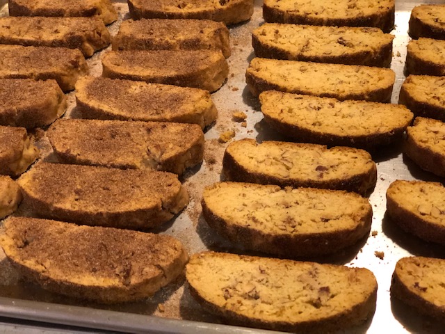 I had to text Lisa to ask her about details, because my memory is a bit fuzzy. Do you sprinkle the cinnamon sugar on the loaves before they are sliced, or on the cut side of the cookies after the loaves have been sliced? Lisa and her mom waited until the cookies were sliced to sprinkle with cinnamon sugar. Lisa asked me if I have a preference… I have tried both ways to see what I like best, and am still trying to decide.