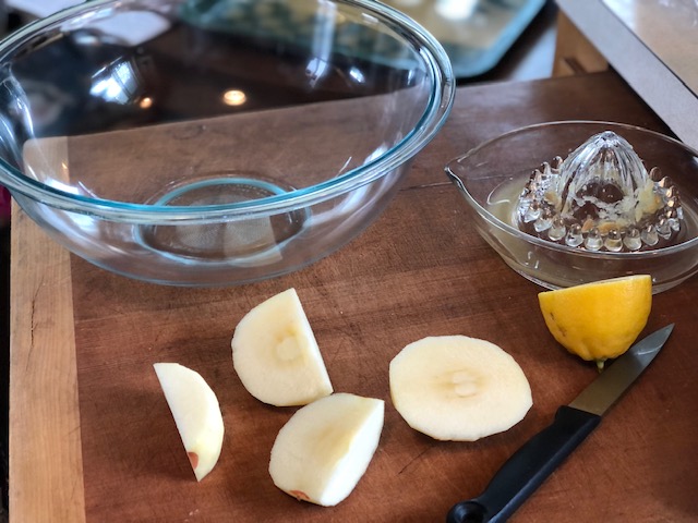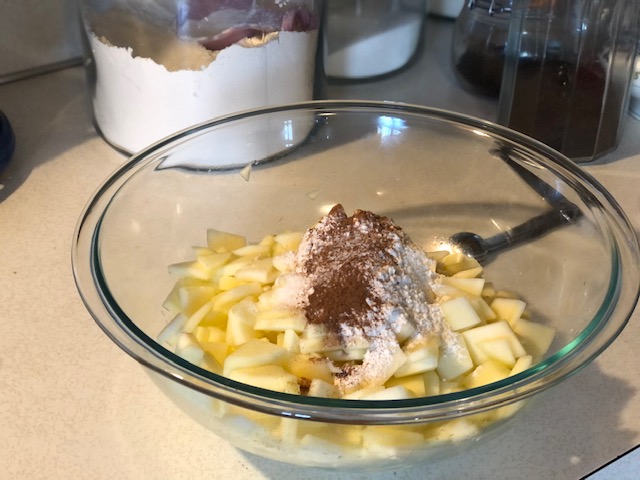 - Peel and core the apples, then slice the apples thinly (1/8″). Place the apple slices in a large bowl, tossing the slices in a bit of lemon juice as you go along. Add the rest of the lemon juice, the sugar, flour, cinnamon, nutmeg and salt and toss everything together.