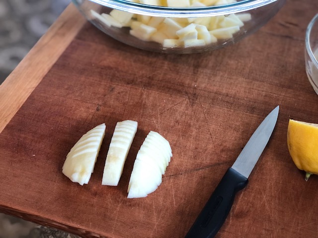 - 5 medium to large apples (I used 3 pink lady and 2 gala), peeled, cored, and thinly sliced (1/8″)