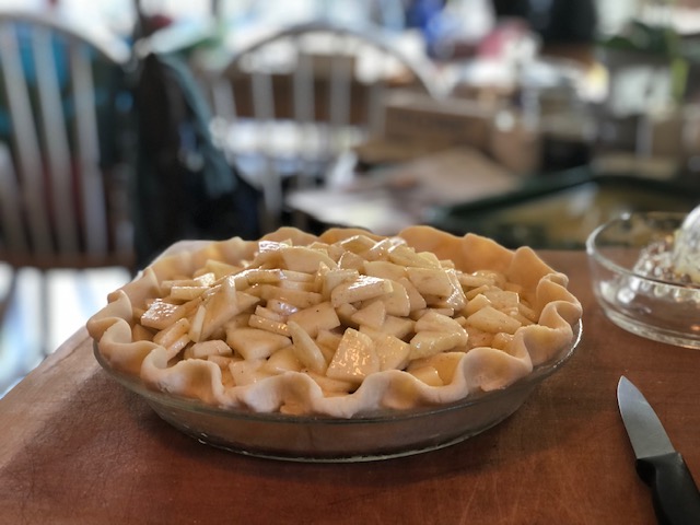 - Remove your pie crust from the freezer. Pour the apples into the crust and mound slightly toward the center. Set aside.