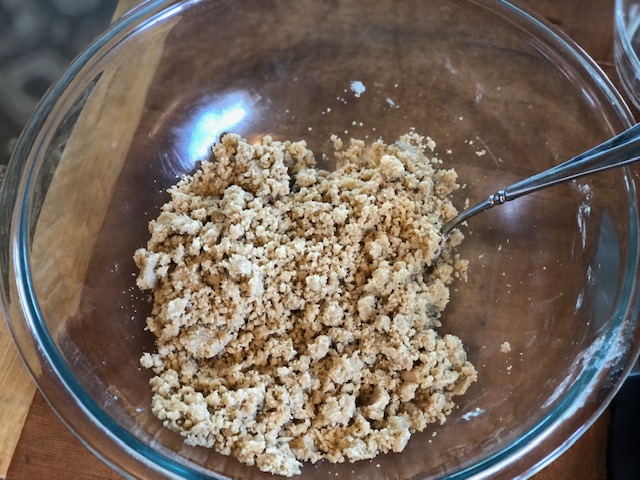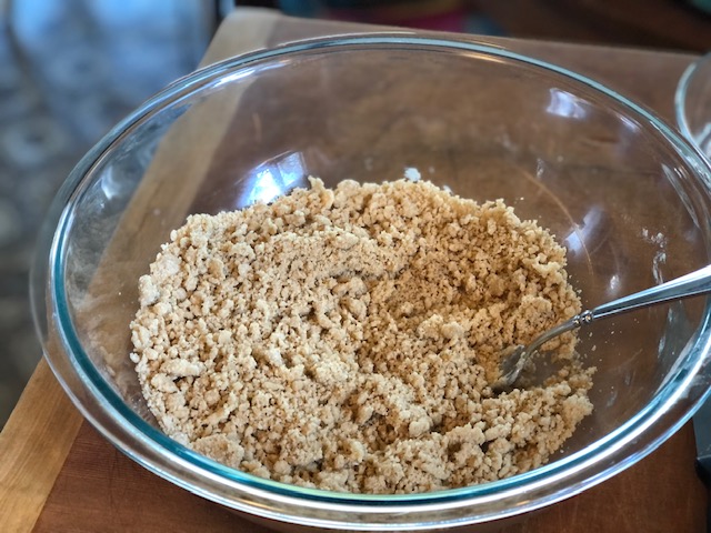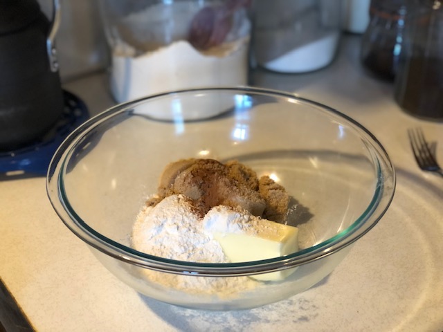 - To make the topping, put softened butter, flour, brown sugar, cinnamon and salt in a medium bowl. Using a fork, mix the ingredients together until you have a crumb consistency. If you want larger crumbs, you can get your hands in there and make some larger crumbs by squeezing some of the smaller crumbs together.