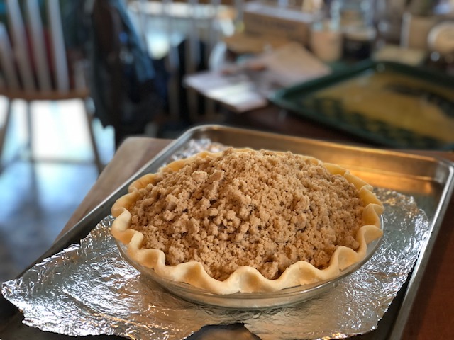- Place the pie on a cookie sheet lined with aluminum foil to catch any overflowing juices. Sprinkle all of the crumb topping on the apples as evenly as possible. Don’t worry if it looks like a big mound; it will bake down. Take another sheet of aluminum foil and lay it gently on top of the pie, making a “tent”.