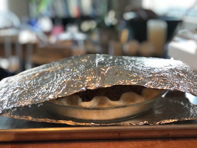 - Place tented pie on the cookie sheet on the bottom rack of oven. Bake for 45 minutes. After 45 minutes, remove the foil tent and turn the temperature down to 375°. Bake for another 30 minutes, or until you see thick juices bubbling up in several places. You can rotate your pan at any point for even baking. Don’t worry if the juices are pooling at the edges (that’s what you want!). Some might even drip over the edge of the pie crust. That’s okay. If the top starts to get too brown, put the foil tent back on.