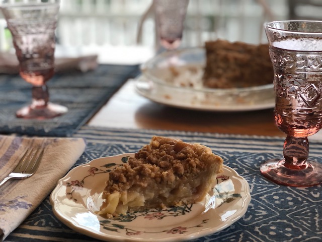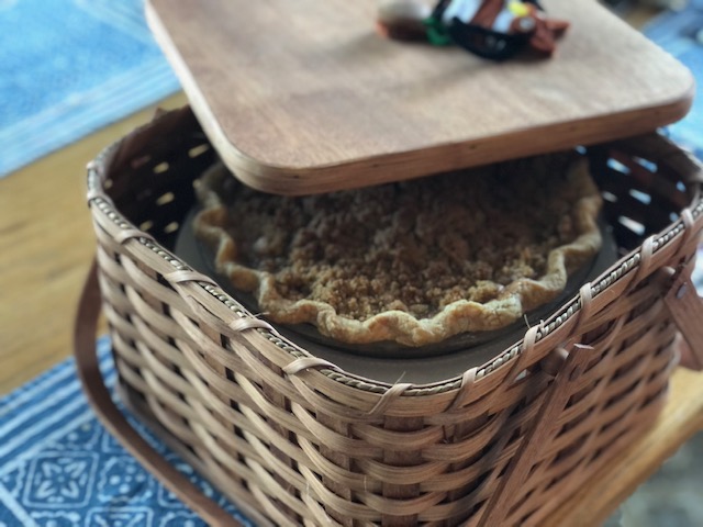 I was worried that maybe the apples would get mushy from being baked too long and being sliced so thin, but that did not happen! I chose gala and pink lady apples, which both hold their shape quite nicely in pies. The result? The apple crumb pie of my dreams. And get this: I made it yesterday in the early evening, so it was too warm to eat. Also too warm to cover or wrap! so I put the pie in my pie basket carrier and put it in our cool temp garage overnight. The pie basket is so great – it protects the pie, but lets it breath. I love my pie basket.