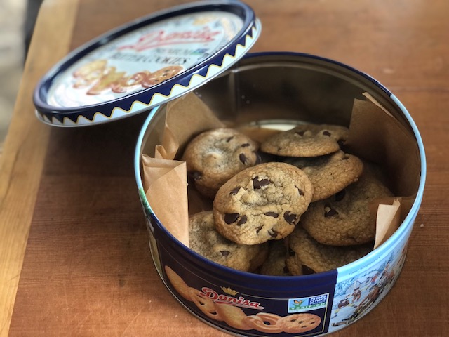 The chocolate chip cookies go in the Danish Butter Cookie tin. Doesn’t everyone have one of those?