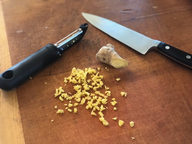 I finally decided to chop ginger the way I imagined Elisa might do it. Kind of with a laissez-faire attitude. Which meant that the ginger was coarsely chopped, not finely chopped. Now I was getting closer.