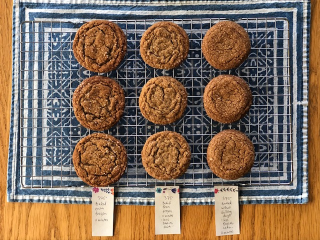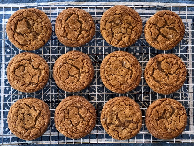 Elisa’s cookies were so delicious, and they had a big burst of spicy fresh ginger that was WOW. So of course I asked her for the recipe. It was Tom Douglass’ recipe for molasses cookies, from The Dahlia Bakery Cookbook. When I made the recipe following Tom’s exact instructions, including weighing all the ingredients, and grating the fresh ginger, my cookies came out flat and kind of greasy. And there was no big WOW of ginger. What on earth happened? I quizzed Elisa about how she made her cookies. Did she weigh the ingredients? Heck no. Did she grate the fresh ginger, as specified? Absolutely not. She chopped the ginger. So I tried making these cookies again, but still failed. This recipe was going to make me crazy. So much testing!!!
