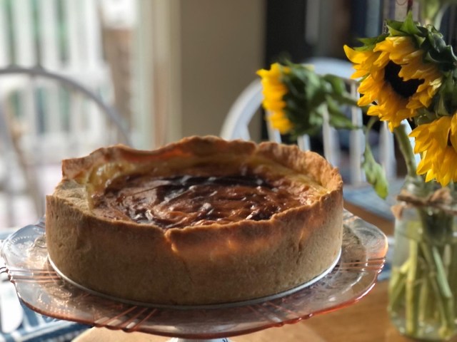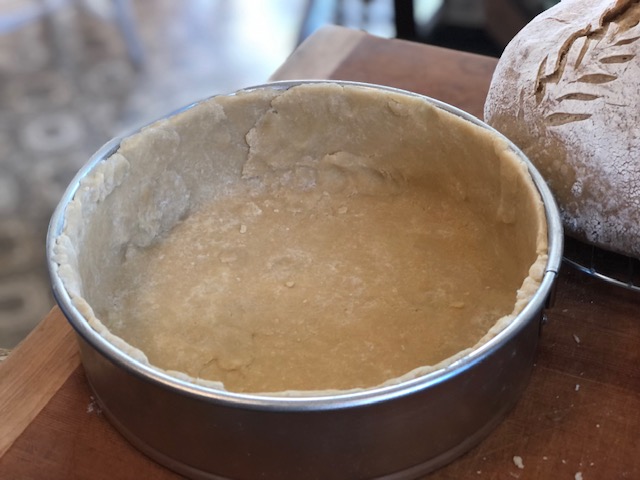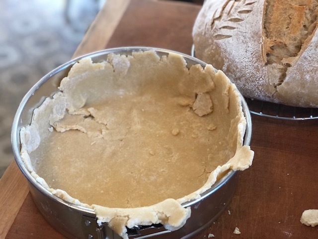 I considered using my own crust recipe, but then decided I would follow the recipe exactly as written, crust and all. And I did have some issues with the crust. It seemed a little dry when I made it. It cracked when I rolled it out. Oh, did it crack. And it was a crazy, falling apart mess when I ever-so-carefully put it into the 9 inch spring form cake pan. But David says in his post: “Use your hands to patch and smooth any wrinkles or cracks. (The dough is quite forgiving once baked and filled so don’t worry if it’s not perfect.)” And it’s just that simple. His attitude is so relaxed. Really, this is baking 101. And here is the crust after I followed David’s directions, all patched and smoothed out.