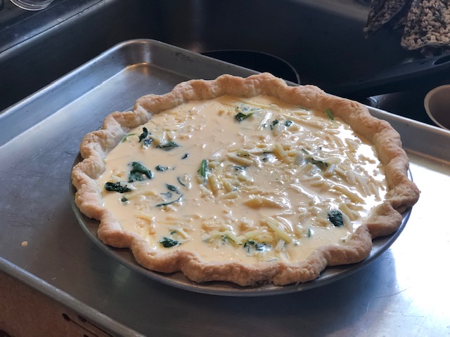 - Sprinkle half of the grated cheese on the bottom of the pie crust, then add the spinach and onion. Sprinkle 1/2 teaspoon fresh cracked pepper evenly over the spinach, then add the rest of the cheese. Slowly pour in the egg custard.
