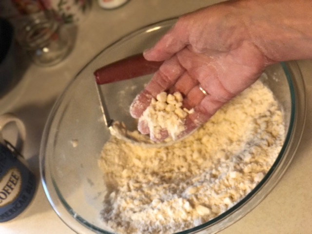 5. Cut butter into the flour mixture with a pastry blender, turning the bowl as you go along. I like to cut the butter in along the side of the bowl. Every now and then, remove butter chunks from the pastry blender with you fingers or a butter knife, and swoosh everything around with the pastry blender to bring up the flour from the bottom of the bowl.