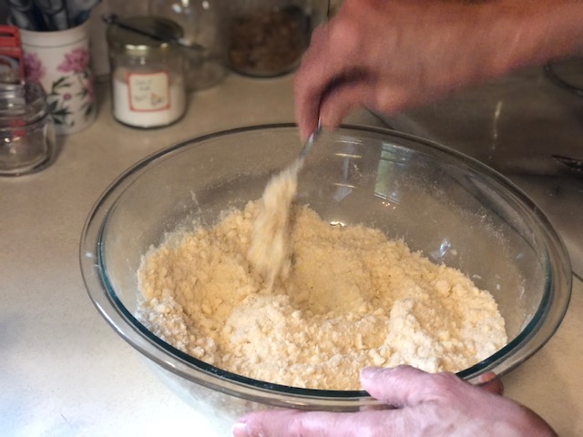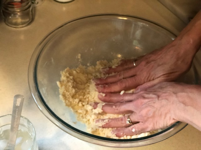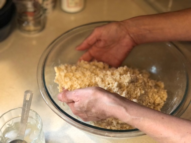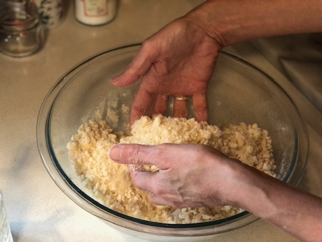 9. Run fingers through the dough, letting it fall through your fingers, to evenly disperse the water. Do this a couple of times.