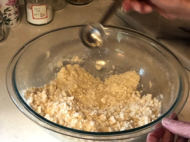 8. Remove ice water/vinegar mix from fridge and remove the ice cubes. Drizzle two tablespoons of the ice water over the flour/butter mix, and toss with a fork. Add two more tablespoons and toss again with a fork. At this point the dough should start to come together a bit, but you might notice how there are dry floury bits at the bottom of the bowl. Scoot some of the dough over to one side to expose the floury part, and toss one tablespoon of ice water with that floury part. Now scoot the other half of the dough over to expose the other half of the floury part. Toss one tablespoon of water with that part. You have now used 6 tablespoons of ice water. That is probably enough, but if you still see too much dry floury stuff, go ahead and toss in a bit more ice water, but go lightly at this point, maybe a teaspoon at a time, until you only see a bit of flour here and there.